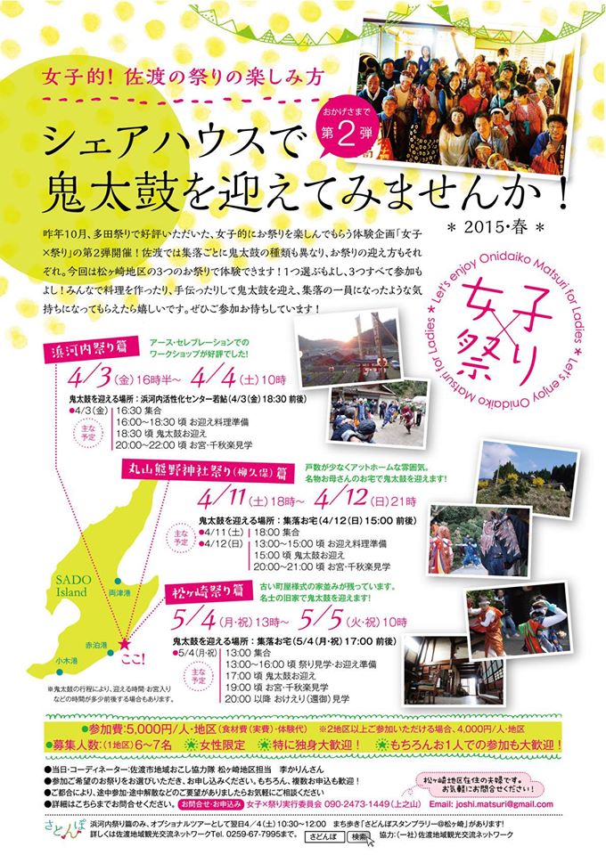 2015年03月12日 08:00 かりん(松ケ崎地区) お祭り/行事 【松ケ崎】女子×祭り 第2弾 募集開始! 「女子的 ! 佐渡の祭りの楽しみの方 シェアハウスで、鬼太鼓を迎えてみませんか」 去年好評だった「女子×祭り」春バージョンで募集始まりました。 今年は松ケ崎の三つの集落で行うことになりました。 「浜河内祭り篇(4/3-4)」 アースセレブレーションで鬼太鼓のワークショップを開き、ファンが多いです 「丸山熊野神社祭り(柳久保)篇(4/11-12)」 アットホームな雰囲気で、名物お母さんと料理を勉強できます 「松ヶ崎祭り篇(5/4-5)」 地元名士の旧家で鬼太鼓を迎えられ、神秘的な祭りです 「女子×祭り」第2弾の魅力を紹介する動画を作りました。 みんなで料理を作ったり、手伝ったりして鬼太鼓を迎え、集落の一員になったような気持ちになってもらえたら嬉しいです。ぜひご参加お待ちしてます。 お問い合わせ・お申し込みは 女子×祭り実行委員会 joshi.matsuri@gmail.com 090-2473-1449(上之山) Facebookのイベントページからも応募可能です 去年の様子はこちらでご覧になられます。 タグ: 女子祭り 松ケ崎 浜河内 柳久保 鬼太鼓 女子会 「かりん(松ケ崎地区)」カテゴリの最新記事 「お祭り/行事」カテゴリの最新記事 コメントする コメントフォーム 名前 コメント 評価する リセット リセット 顔 星 投稿する 情報を記憶