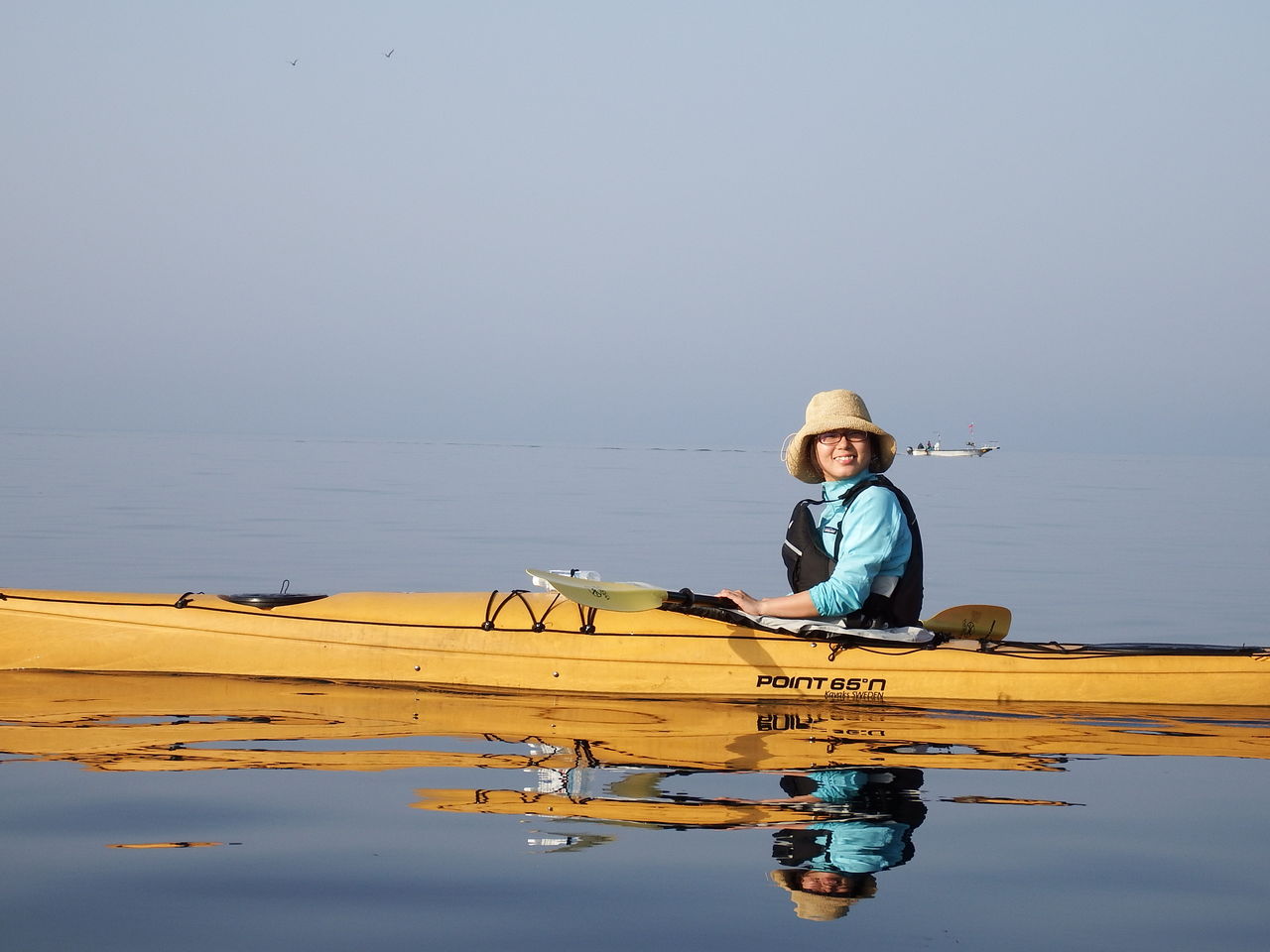 海面では漁船と遭遇、船と並走できるのもシーカヤックならでは体験。