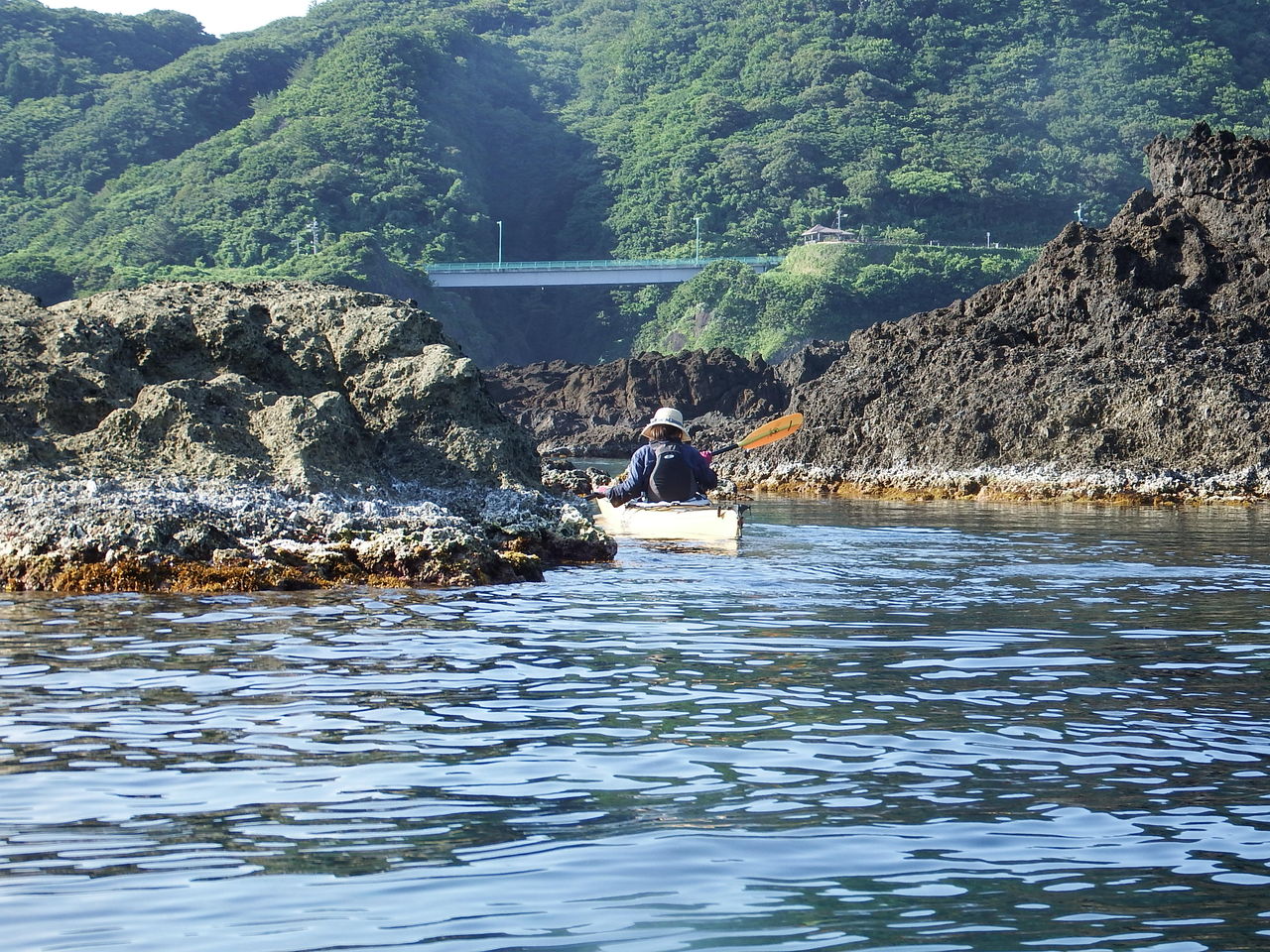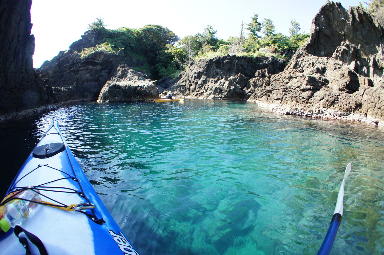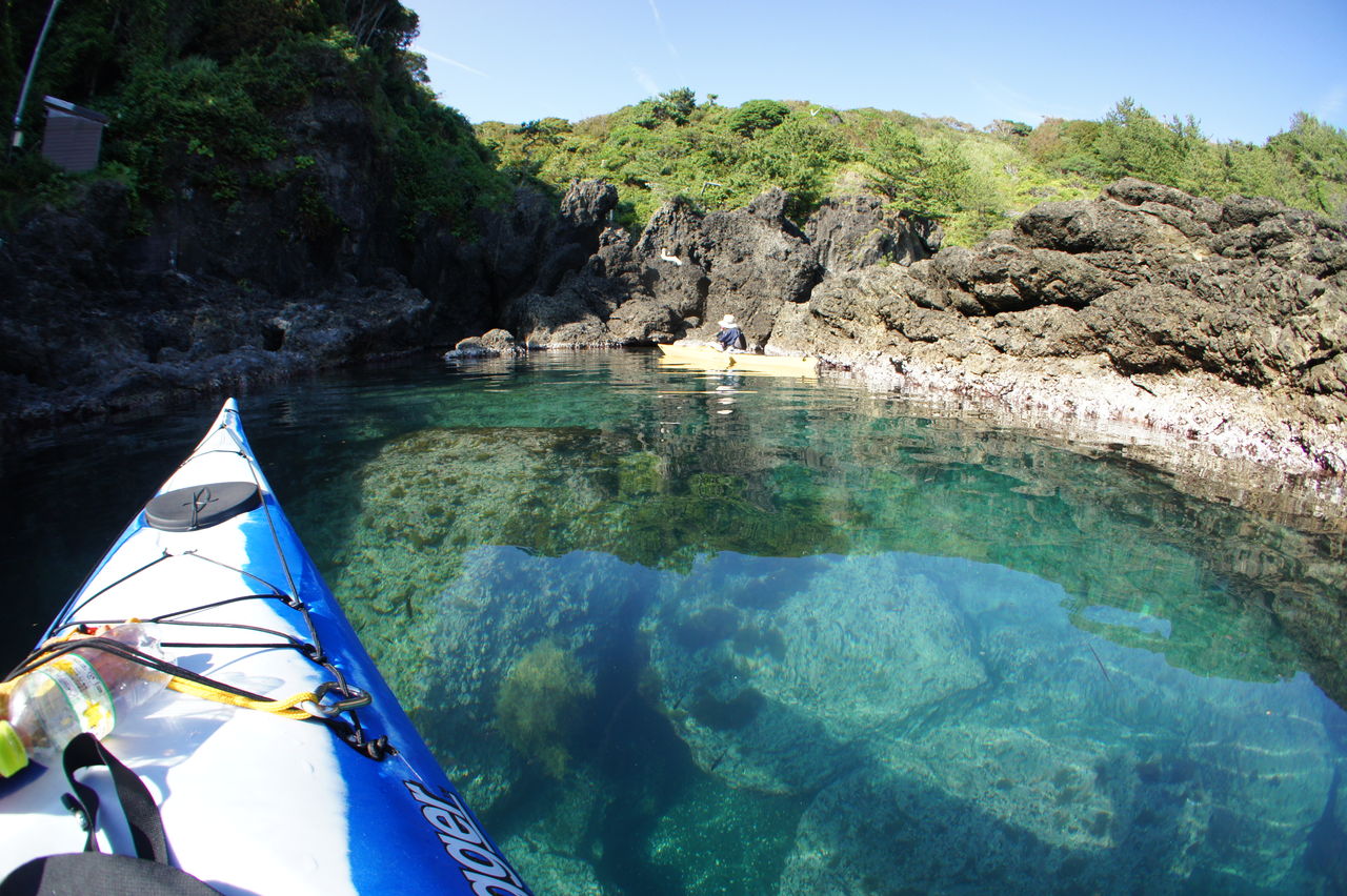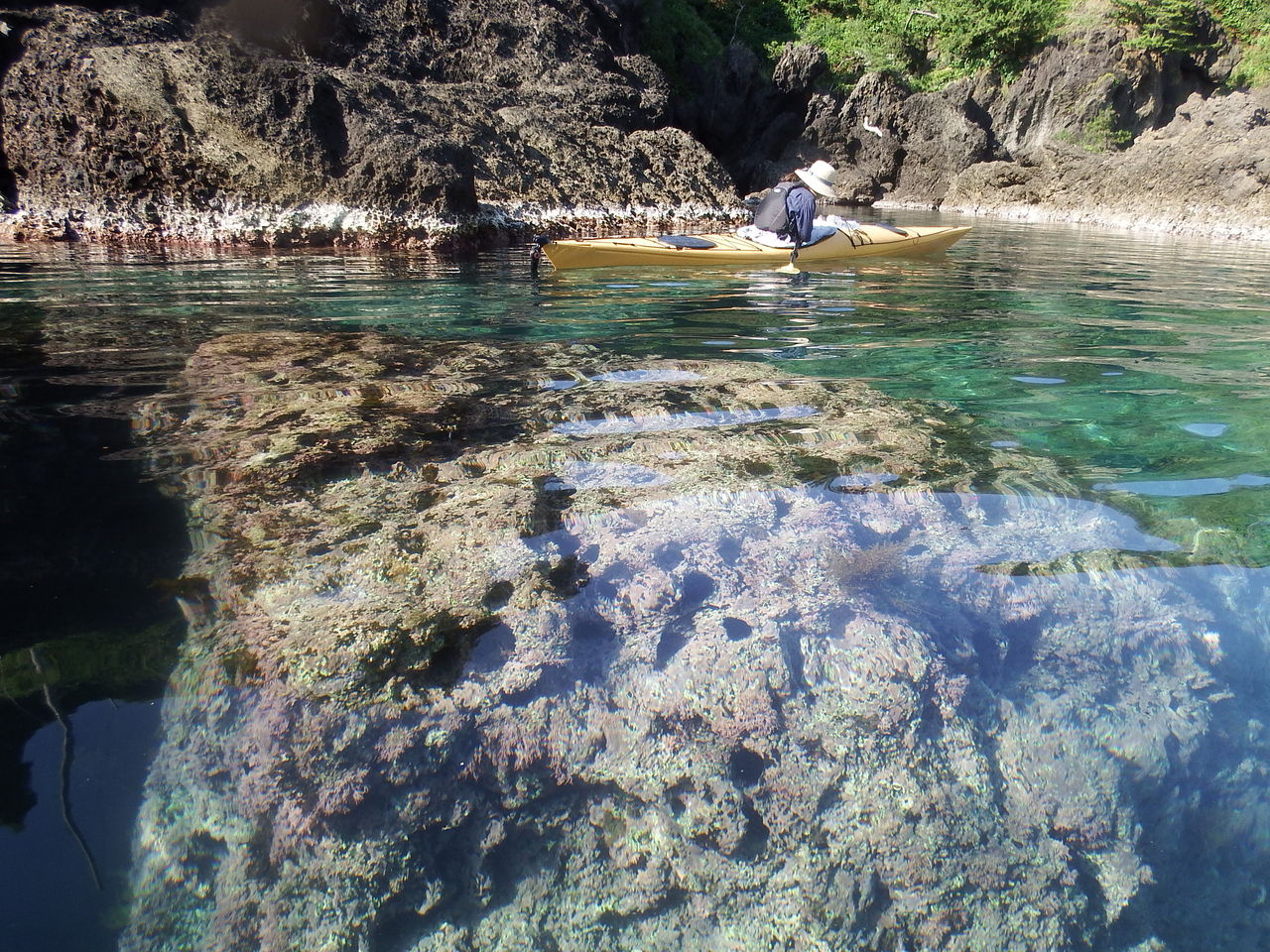 一つ目のピン落とした入江に到着、水面下の岩や、岩と岩の間の溝がくっきり見えます。見とれてしまいます。こういう景色を見れるのもシーカヤックならではのところ。