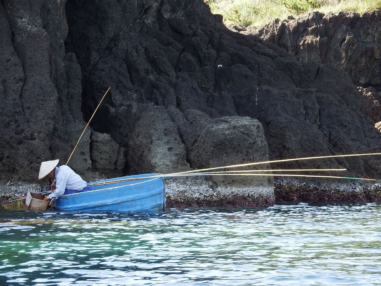 岬を回って次の入江へ入ろうとする瞬間なんと!現役働くたらい舟発見!
