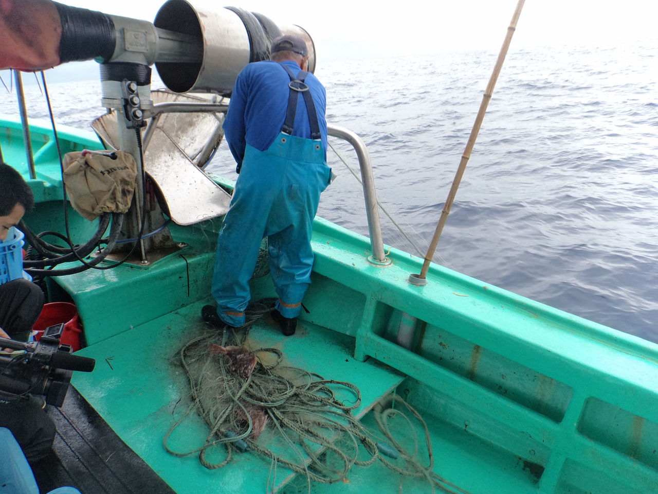 日本海に寒冷前線を伴う低気圧が移動中のさ中、今朝、本船「第三岩﨑丸」さんの操業を見学させて頂きました。本船は赤泊でも珍しい“親子船”で堅実に各漁をこなす優良船の様です。