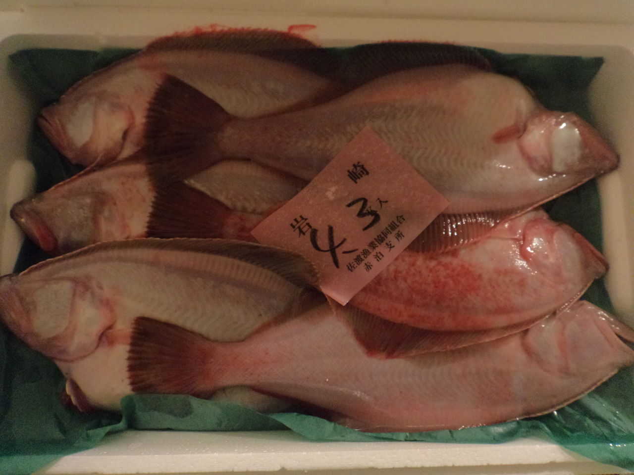 さて、本船は赤泊漁港を出航後、一路松ヶ崎灯台沖の漁場へ向かいました。漁場までは約40分、水深375m地点です。数日前に仕掛けた網を引き揚げます。網上げは師匠の親父さんです。水深からして、浮標綱はかなりの長さです、20分近く掛りました。そのロープに続き、やっと身網が上がって来ました。アカガレイの30-50cmサイズがちょうど外すには良い間隔で上がって来ます。その他にマダラ、海カジカ、エイ、コンコン(タナカ・ゲンゲ)などが副産物として掛かって来ます。揺れるデッキでこれらの魚を、網を揚げながら外して行くには大変な作業ですし、素人にとっては船酔いの素です。この様な作業を時化でもされているのですから、苦労の多い職場だと思います。この労力に見合うだけの収入があれば愚痴もこぼさずされるのでしょうが、現実は厳しい様です。結局、カレイは8ケース、マダラ5ケースチョット出来た様です。あと一か月もすると、ズワイガニ漁が始まる事でしょう。