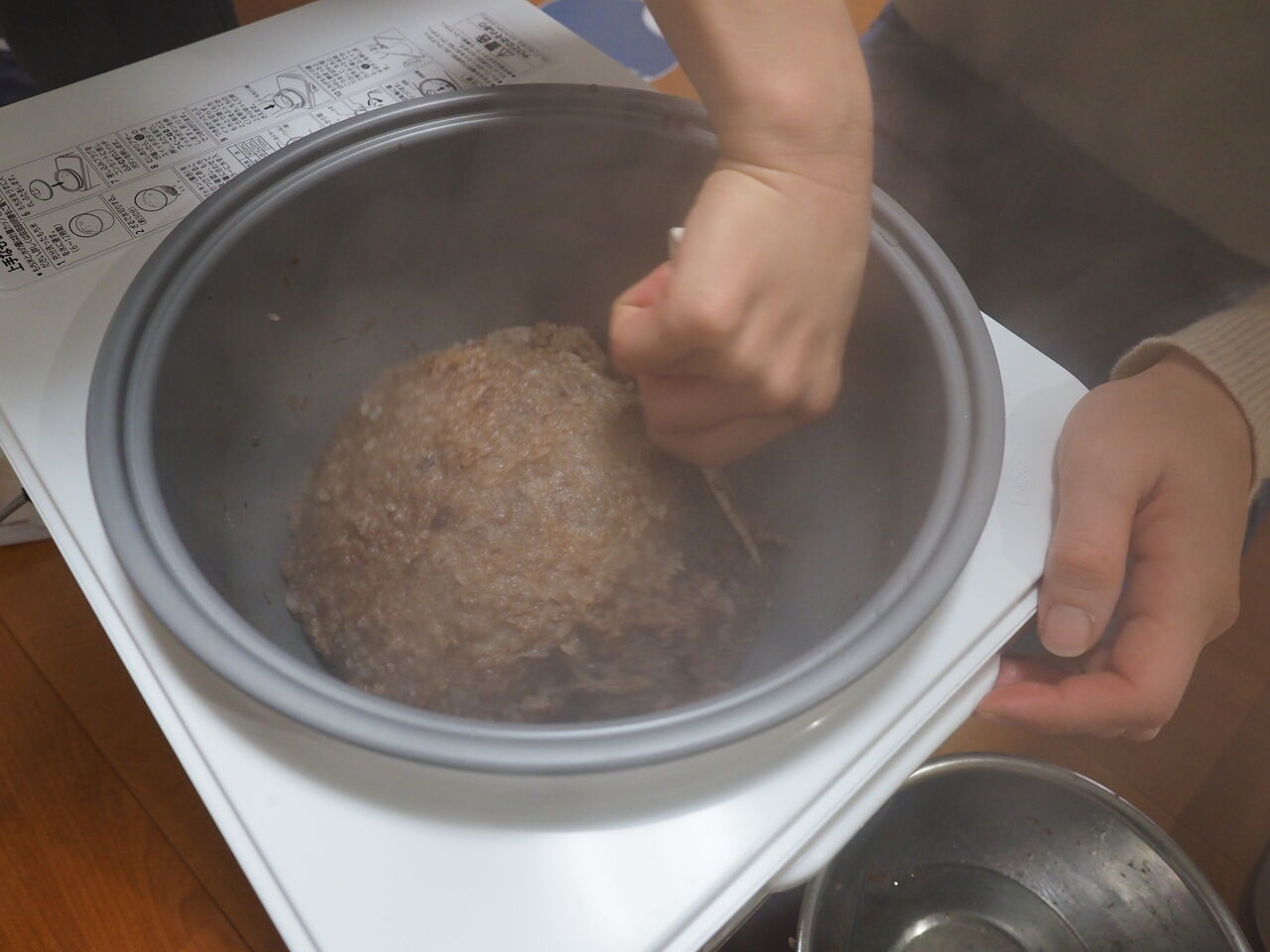 もちつき機で米をつきながら、上表面にある干し柿を下へ下へと少しずつ押しつけながら、練り込んでいきます。