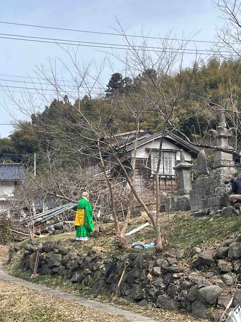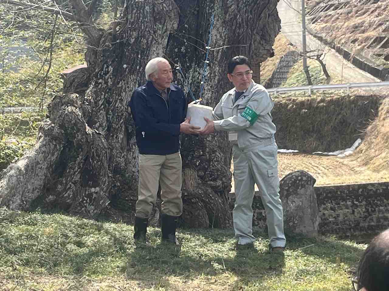 植樹は育種センターから地域へ苗木の贈呈のあと、法乗坊を管理するご住職の読経が行われました。