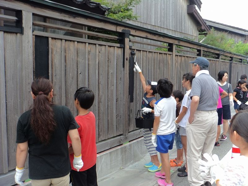 とは言っても、町屋を改装するには大きな費用が必要ですので、まずは自分たちで出来る事から始めようと、子供達と一緒に空き家となっている大きな屋敷の黒塀を塗る事にしました。