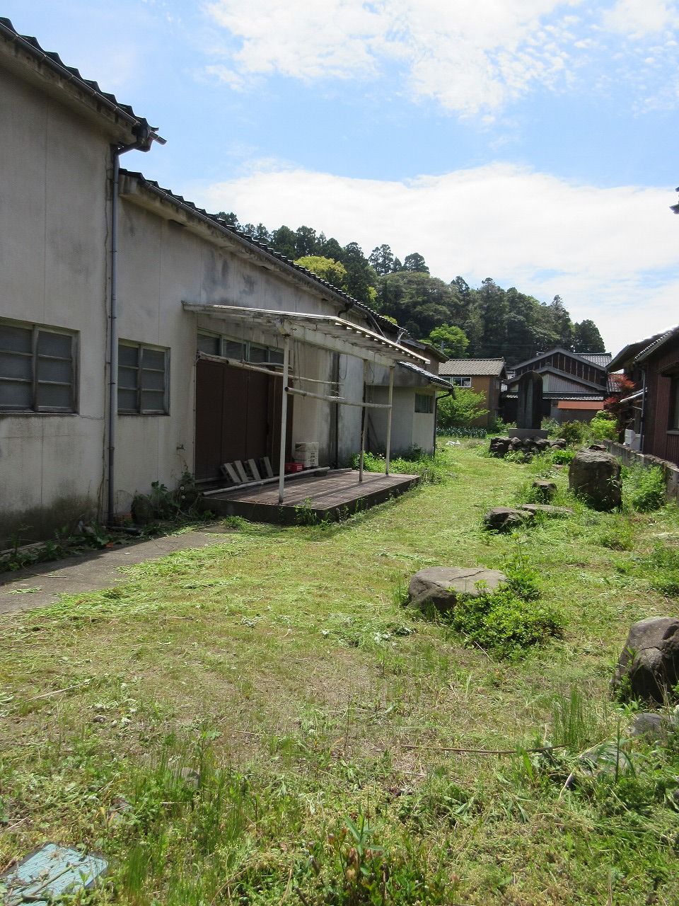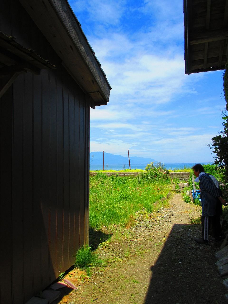 一番奥の納屋から家を見たところ。納屋の次は加茂湖へつながる庭です。
