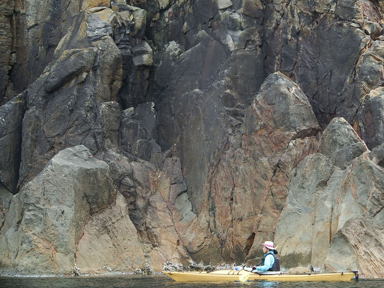 漁港の場所をお借りして出航、浜を通ったらこんな断崖絶壁に会いました。シーカヤックが笹の葉っぱに見えます。